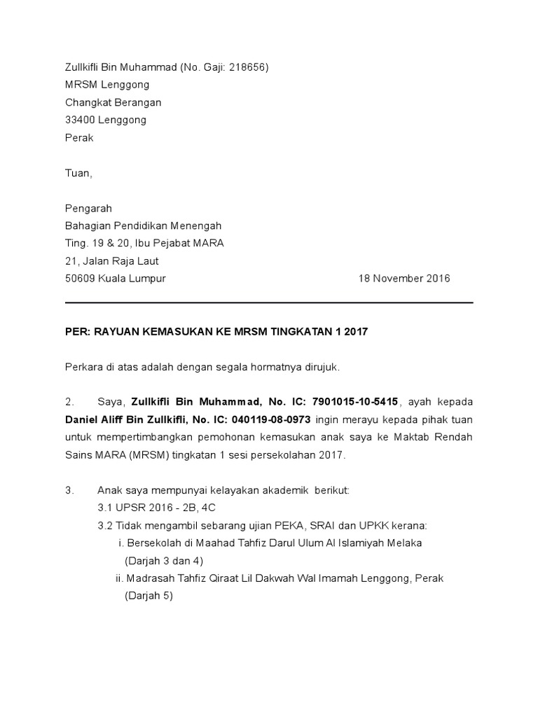 Surat Rayuan Kemasukan Ke Mrsm Pdf